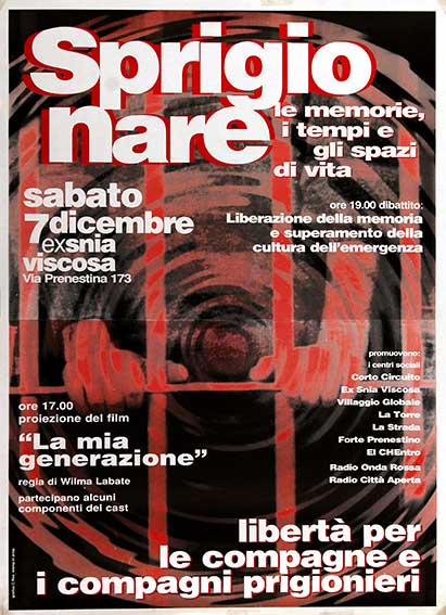 sprigionare le memorie, i tempi e gli spazi di vita Dibattito: Liberazione della memoria … Proiezione del film “La mia generazione” … Libertà per le compagne e i compagni prigionieri. [Vari] Roma, 1996 numero: 0850dimensione: 88x64cm Catalogo Manifesti, Centri sociali, laboratori e spazi occupati, Cultura Antagonista, Radio di movimento, Radio Onda Rossa, repressione centri sociali
