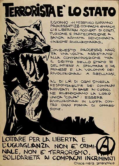 terrorista è lo stato Il giorno 11 febbraio saranno processati 28 compagni anarchici e libertari … Lottare per la libertà e l’uguaglianza non è criminale, non è terrorismo … Croce nera anarchica Carrara numero: 0727dimensione: 84x60cm Catalogo Manifesti, Lotta Armata - Carcere e Repressione, Movimento Anarchico