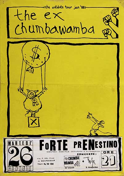 The Ex Chumbawamba The antidote tour jan ’88 Martedì 26 Gennaio C.S.O.A. Forte Prenestino Roma, 1988 numero: 1379dimensione: 62x44 cm Catalogo Manifesti, Centri sociali, laboratori e spazi occupati, Cultura Antagonista