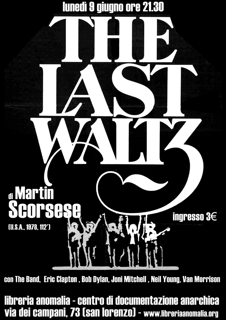 The last waltz di Martin Scorsese con The Band, Eric Clapton, Bob Dylan, Joni Mitchell, Neil Young, Van Morrison (U.S.A. 1978, 112′) ingresso 3 € cinema, Iniziative, PROIEZIONI