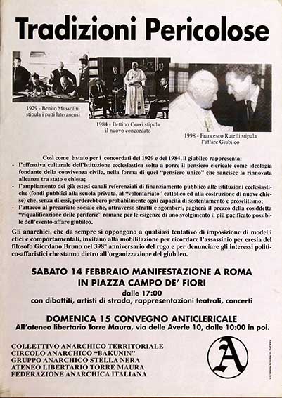 Tradizioni pericolos Così come è stato per i concordati del 1929 e del 1984, il giubileo rappresenta … Manifestazione a Campo de’ Fiori, convegno anticlericale. Anarchici vari Roma numero: 2165dimensione: 70x50cm Catalogo Manifesti, Movimento Anarchico