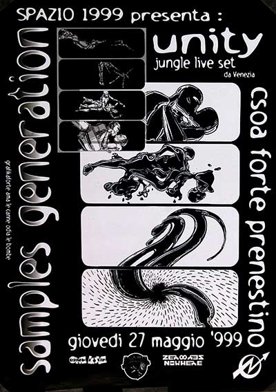 Unity jungle live set da Venezia Sample generation al C.S.O.A. Forte Prenestino Spazio 1999 Roma, 1999 numero: 1316dimensione: 64x44 cm Catalogo Manifesti, Centri sociali, laboratori e spazi occupati, Cultura Antagonista